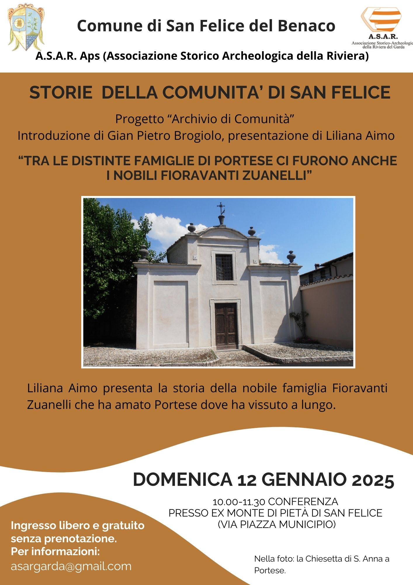 Domenica 12 gennaio alle h. 10.00, presso l’Ex Monte di Pietà di San Felice del Benaco, Liliana Aimo presenterà la storia della famiglia Fioravanti Zuanelli, che ha amato e vissuto a Portese e in altri comuni limitrofi. In questa occasione sarà anche possibile rinnovare il tesseramento all’ASAR per l’anno 2025, grazie al quale riceverete inContinua a leggere “I nobili Fioravanti Zuanelli di Portese”